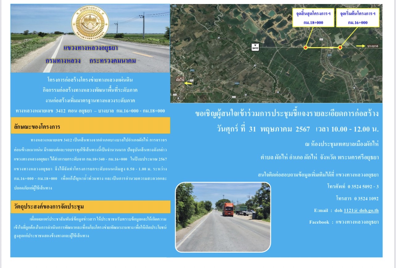 โครงการก่อสร้างโครงข่ายทางหลวงแผ่นดิน กิจกรรมก่อสร้างทางหลวงพัฒนาพื้นที่ระดับภาค งานก่อสร้างเพิ่มมาตรฐานทางหลวงระดับภาค ทางหลวงหมายเลข 3412 ตอน อยุธยา - บางบาล กม.16+000 - กม.18+000