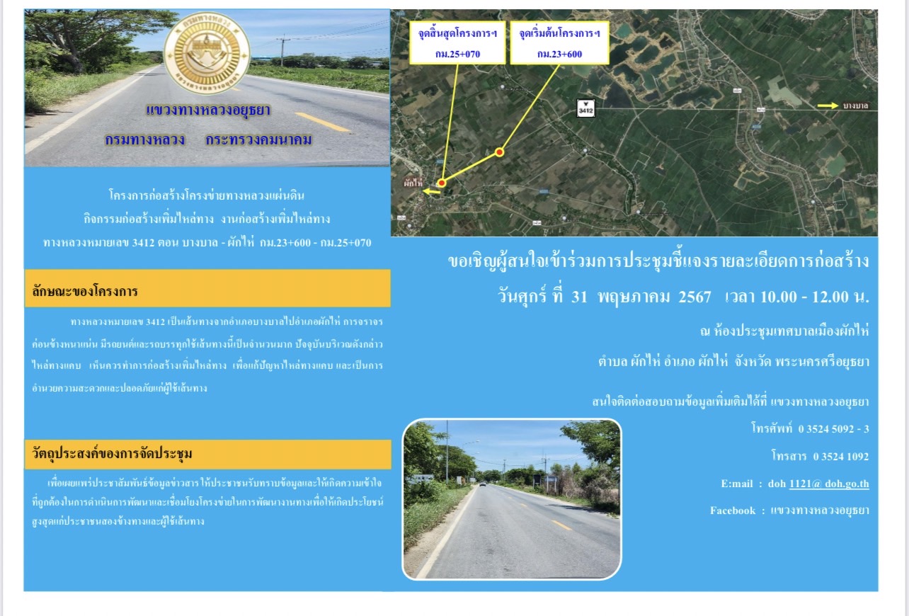 การพัฒนาทางหลวงเพื่อสนับสนุนระบบคมนาคมและโลจิสติกส์กิจกรรมก่อสร้างเพิ่มไหล่ทาง ทางหลวงหมายเลข 3412 ตอน อยุธยา - บางบาล