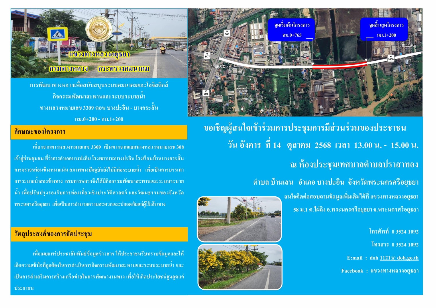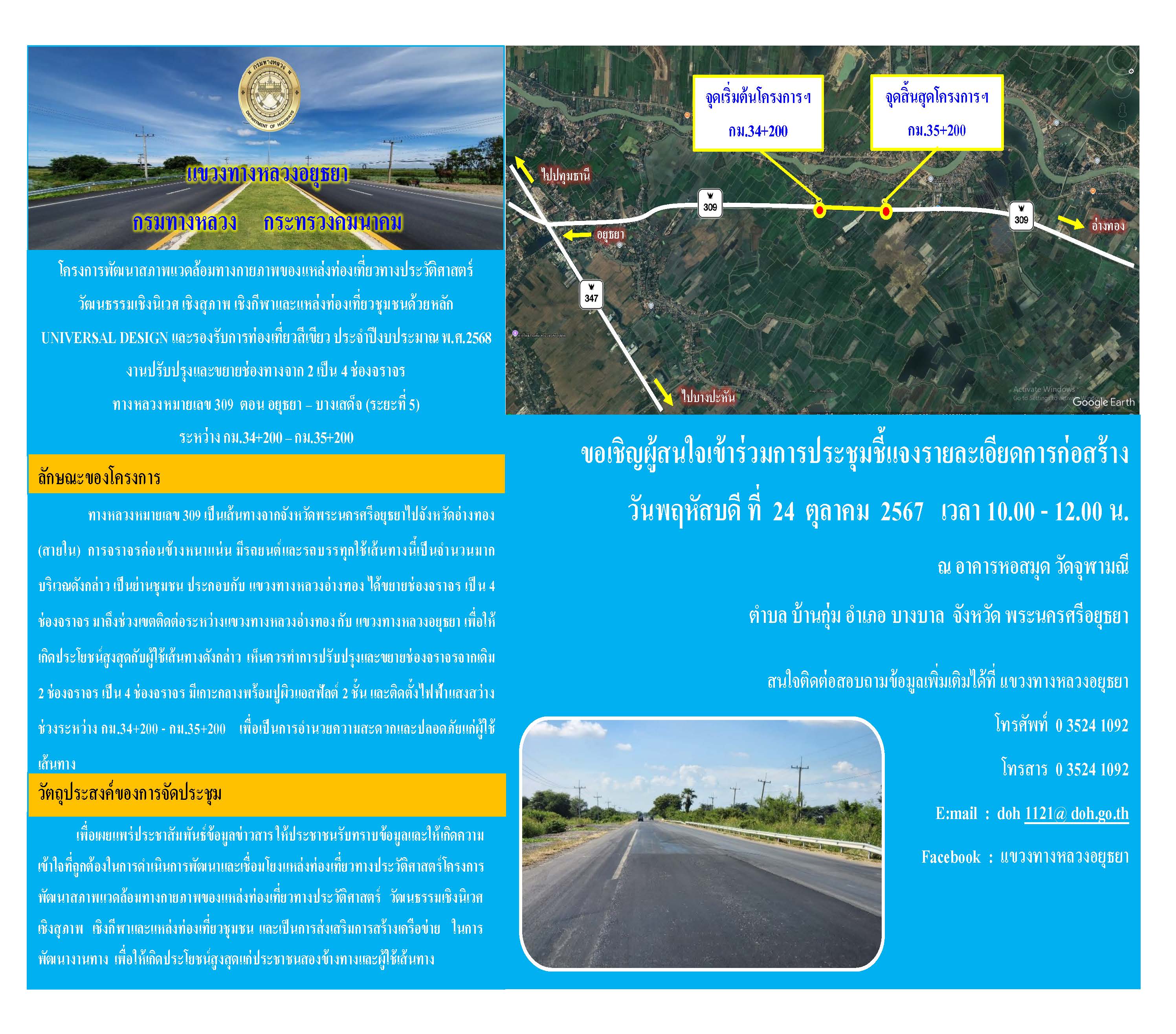 โครงการพัฒนาสภาพแวดล้อมทางกายภาพของแหล่งท่องเที่ยวทางประวัติศาสตร์ วัฒนธรรมเชิงนิเวศ เชิงสุภาพ เชิงกีฬาและแหล่งท่องเที่ยวชุมชนด้วยหลัก UNIVERSAL DESIGN และรองรับการท่องเที่ยวสีเขียว ประจำปี งบประมาณ พ.ศ.2568 งานปรับปรุงและขยายช่องทางจาก 2 เป็น 4 ช่องจราจร ทางหลวงหมายเลข 309 ตอน อยธุยา – บางเสด็จ (ระยะที่ 5) ระหว่าง กม.34+200 –กม.35+200