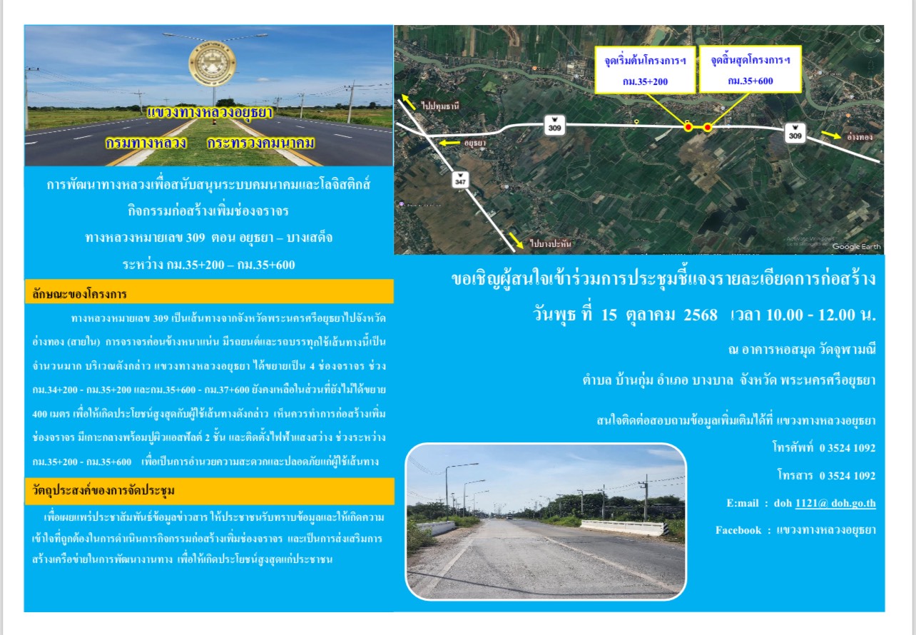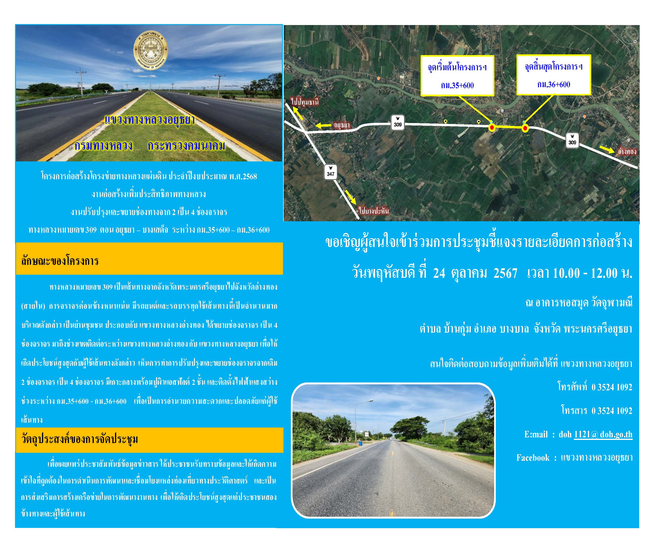 ครงการก่อสร้างโครงข่ายทางหลวงแผ่นดิน ประจำปี งบประมาณ พ.ศ.2568 งานก่อสร้างเพิ่มประสิทธิภาพทางหลวง งานปรับปรุงและขยายช่องทางจาก 2 เป็น 4 ช่องจราจร ทางหลวงหมายเลข 309 ตอน อยธุยา – บางเสด็จ ระหว่าง กม.35+600 –กม.36+600