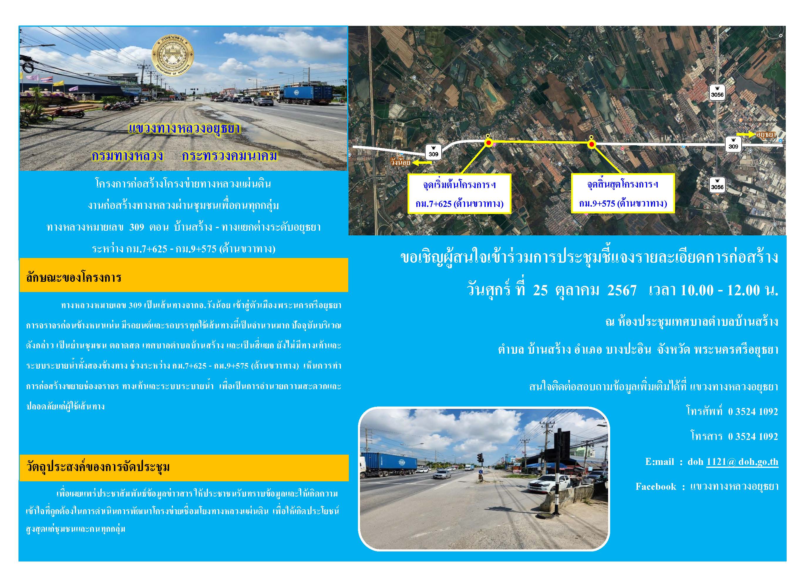 โครงการก่อสร้างโครงข่ายทางหลวงแผ่นดิน งานก่อสร้างทางหลวงผ่านชุมชนเพื่อคนทุกกลุ่ม ทางหลวงหมายเลข 309 ตอน บ้านสร้าง - ทางแยกต่างระดบัอยุธยา ระหว่าง กม.7+625 -กม.9+575 (ด้านขวาทาง)