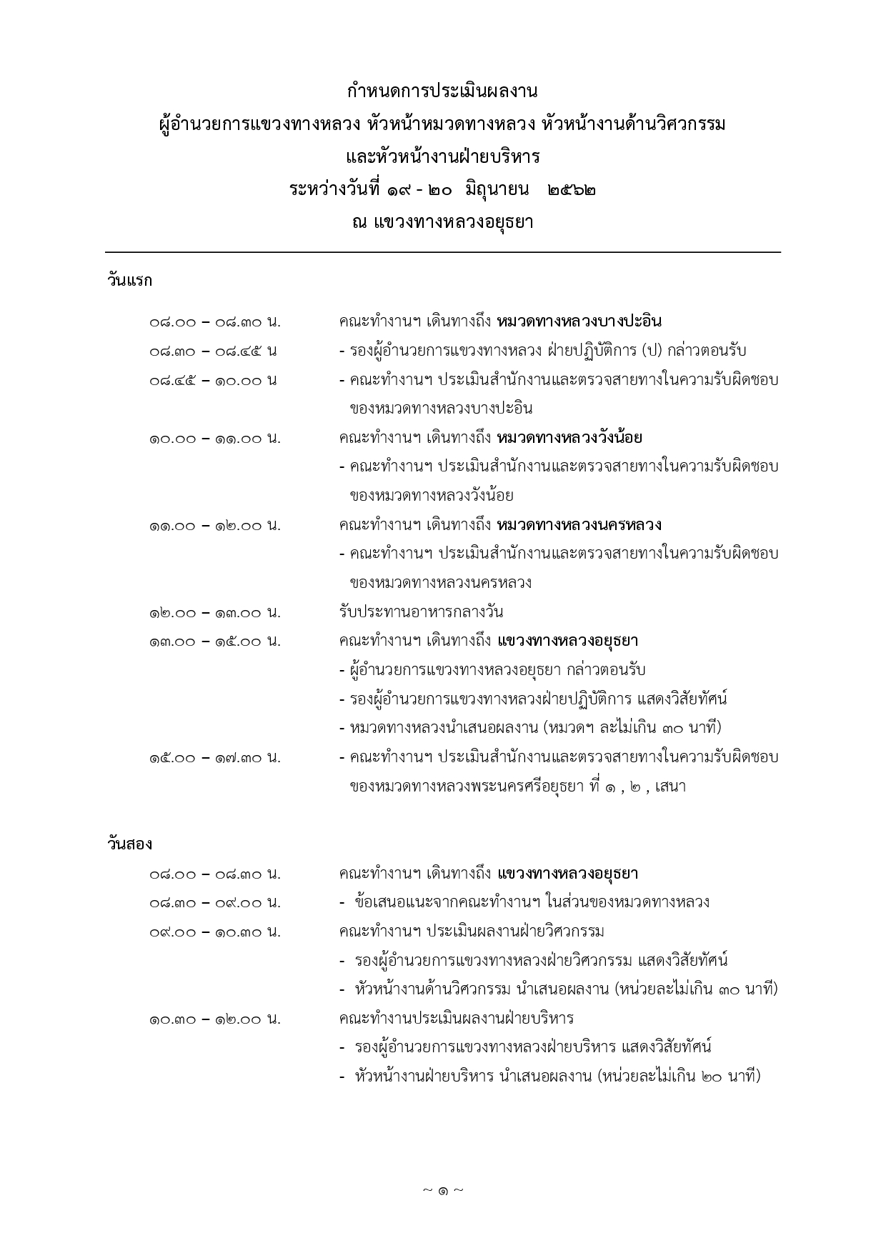 วันพุธที่ 19 มิถุนายน 2562 นายพรพรต สุริยนต์ รองผู้อำนวยการสำนักงานทางหลวงที่ 13 ตำแหน่งที่ 1 (ประธาน) และคณะทำงานฯ ตรวจติดตามและประเมินผลงานการปฏิบัติและการบริหารงานของฝ่ายปฏิบัติการ แขวงทางหลวงอยุธยา ตลอดจนหน่วยงานในสังกัด ให้มีประสิทธิผลเป็นไปตามหลักวิชาการ สอดคล้องกับนโยบายของกรมทางหลวง เกิดผลสัมฤทธิ์ในการพัฒนาการบริหารงานโดยรวม เพื่อประกอบการพิจารณาในการดำเนินการคัดเลือกผู้อำนวยการแขวงทางหลวง หัวหน้าหมวดทางหลวง และหัวหน้างานฝ่ายวิศวกรรม ในระดับสำนักงานทางหลวง เสนอคณะอนุกรรมการประเมินผลงานบำรุงทาง งานอำนวยความปลอดภัย ประจำภาค ปี 2562 เพื่อพิจารณาประเมินผลงานดีเด่นต่อไป โดยมี นายทรงยศินทร์ ชนปทาธิป ผู้อำนวยการแขวงทางหลวงอยุธยา พร้อมเจ้าหน้าที่ในสังกัด และผู้ที่เกี่ยวข้องให้การต้อนรับ และฝ่ายปฏิบัติการนำเสนอผลงานต่อคณะทำงานฯ ณ ห้องประชุมแขวงทางหลวงอยุธยา