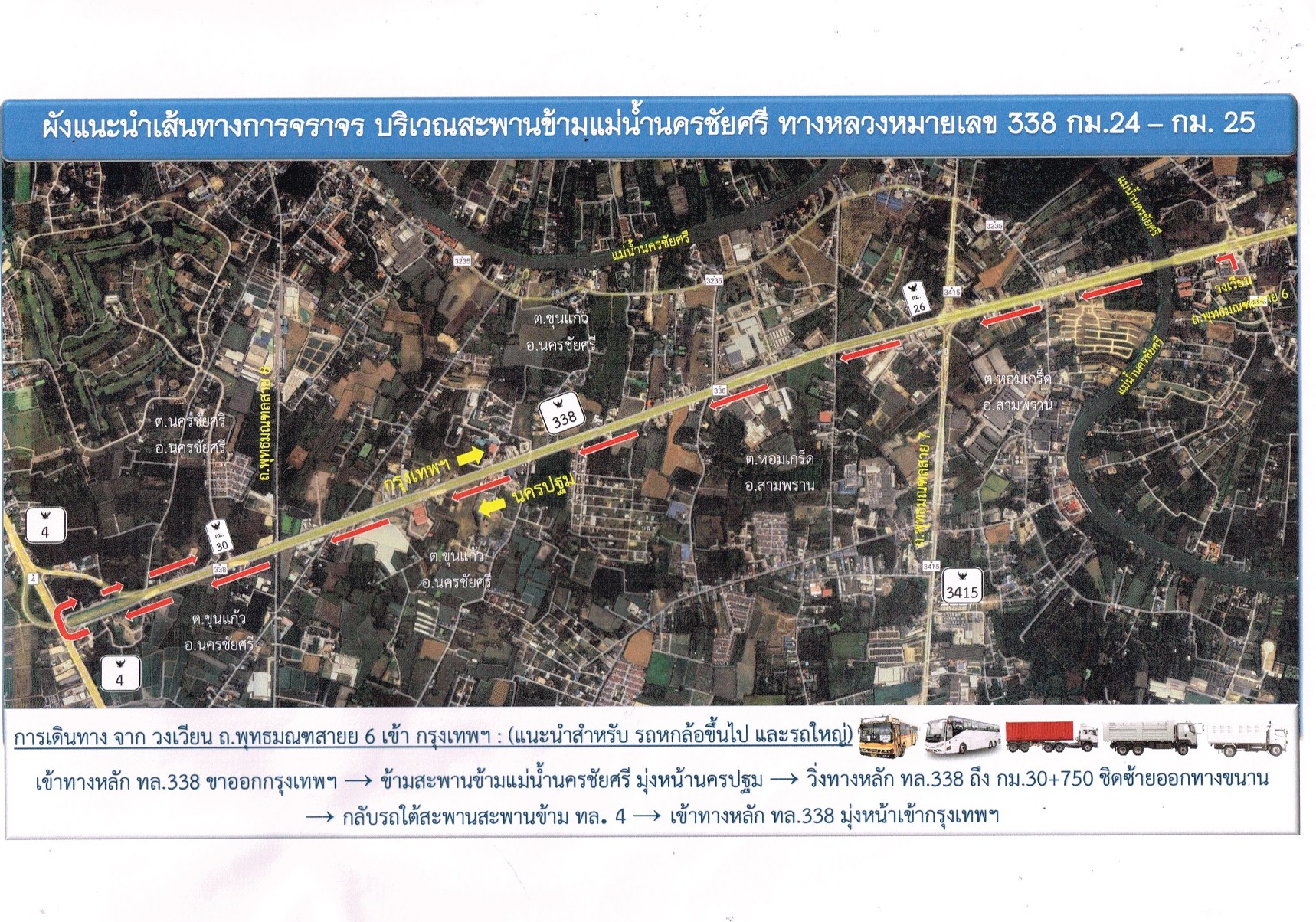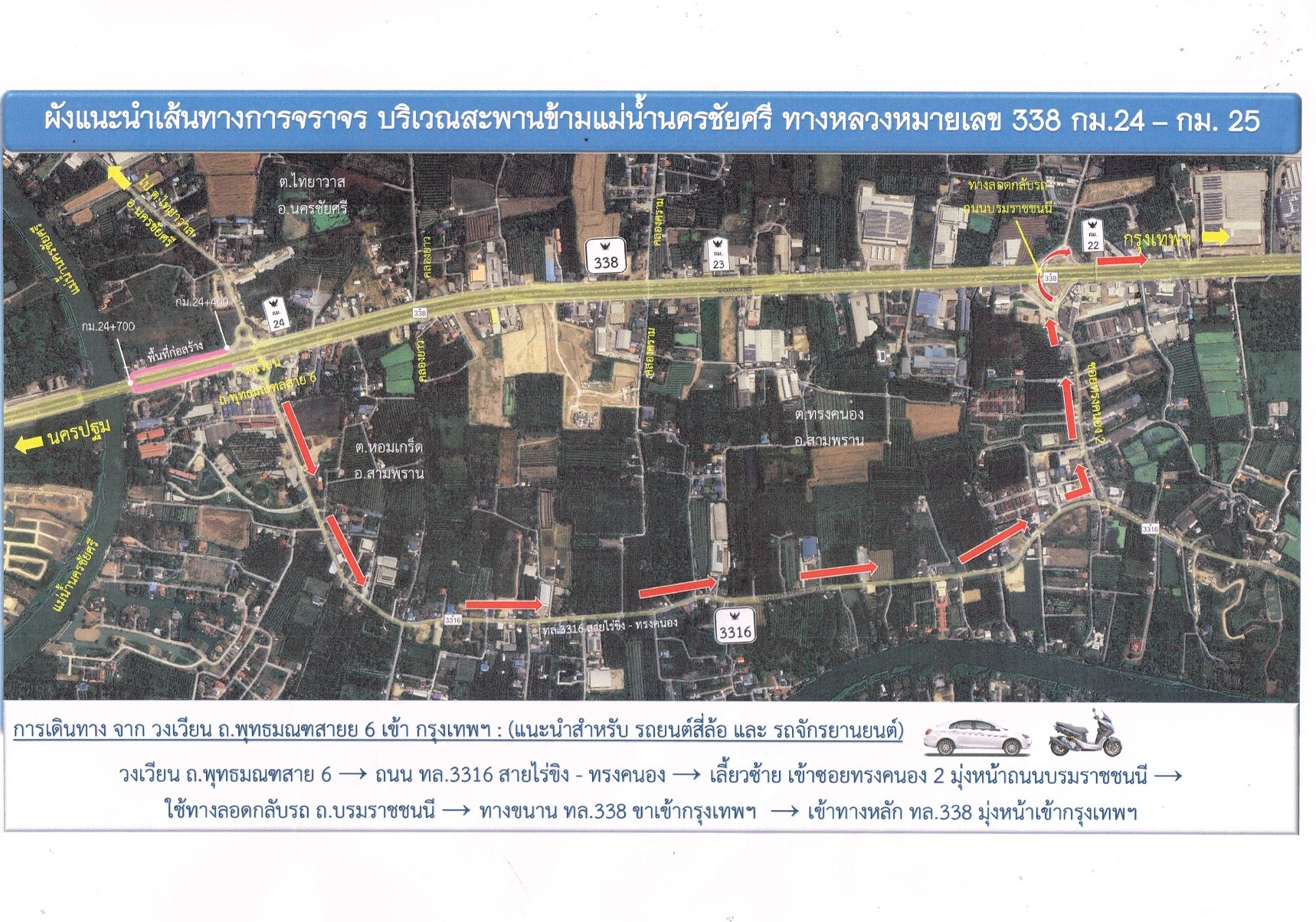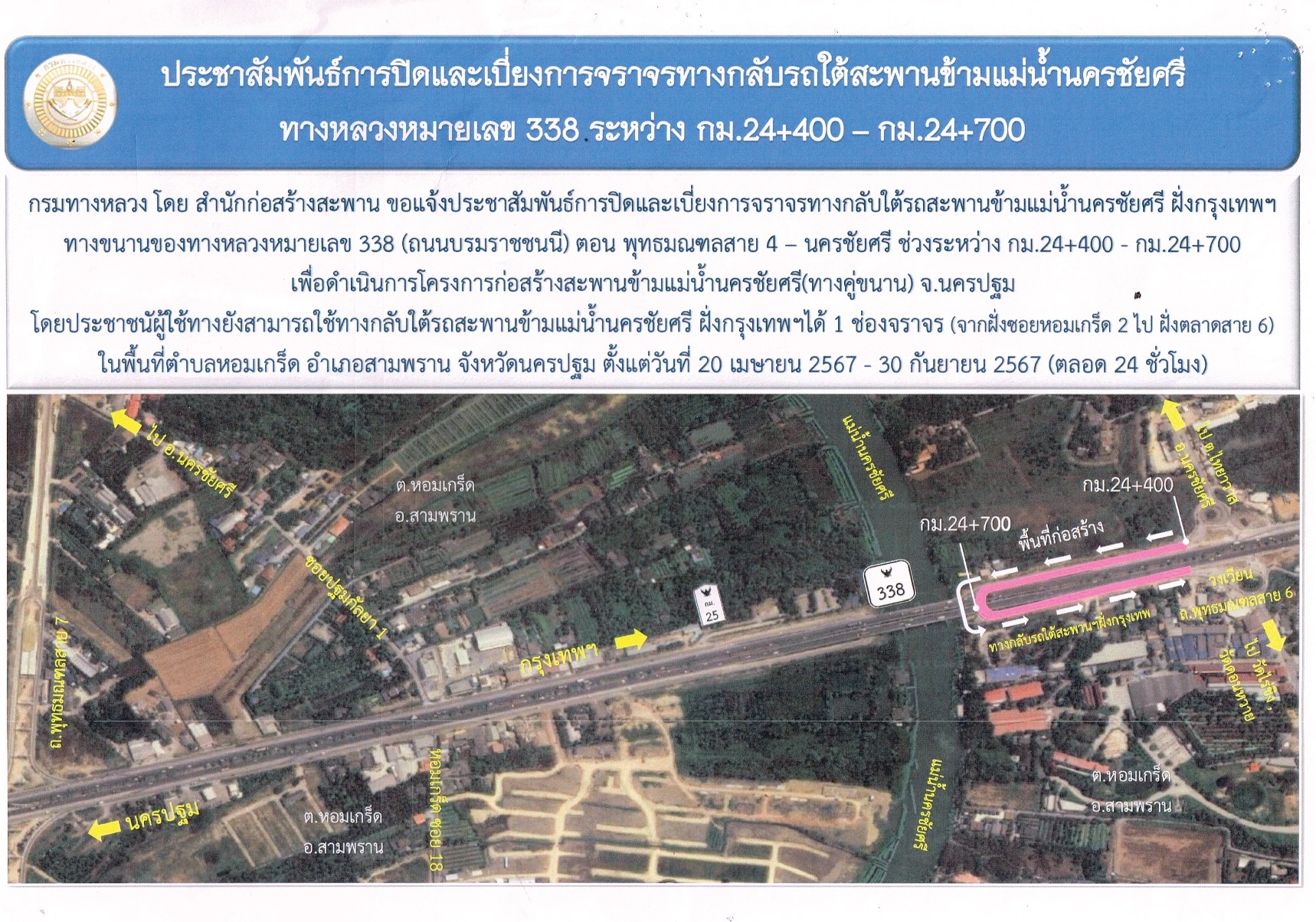 แจ้งประชาสัมพันธ์การปิดและเบี่ยงการจราจรทางกลับรถใต้สะพานข้ามแม่น้ำนครชัยศรี ฝั่งกรุงเทพฯ บนทางหลวงหมายเลข 338 (ถนนบรมราชชนนี) กม.24+500
