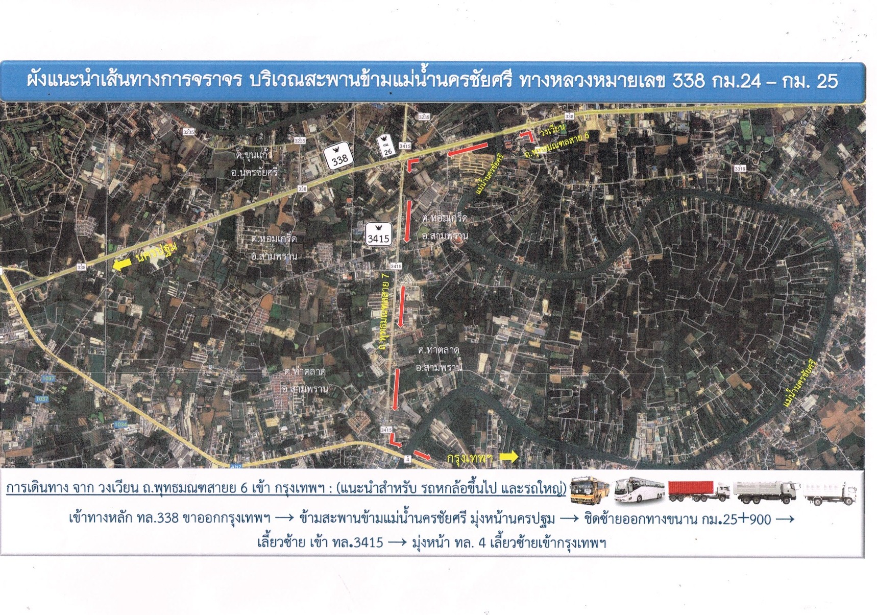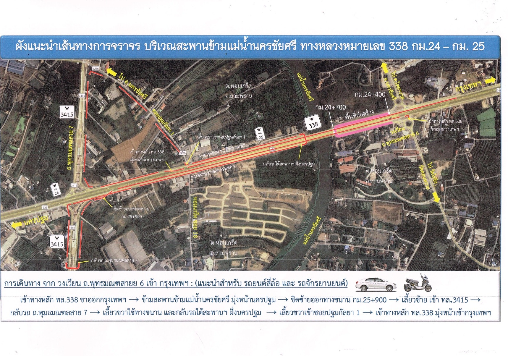 ผู้รับจ้าง มีแผนงานเข้าดำเนินการก่อสร้างขยายสะพานข้ามแม่น้ำนครชัยศรี ฝั่งกรุงเทพ ฯ ด้านซ้ายทางและขวาทาง (ขาเข้าและขาออกกรุงเทพฯ)บริเวณทางหลวง หมายเลข 338 (ถนนบรมราชชนนี) ช่วง กม.24+400 - กม.24+700 ดังนั้นเพื่อเป็นการอำนวยความสะดวกและปลอดภัยแก่ประชาชนผู้ใช้เส้นทาง