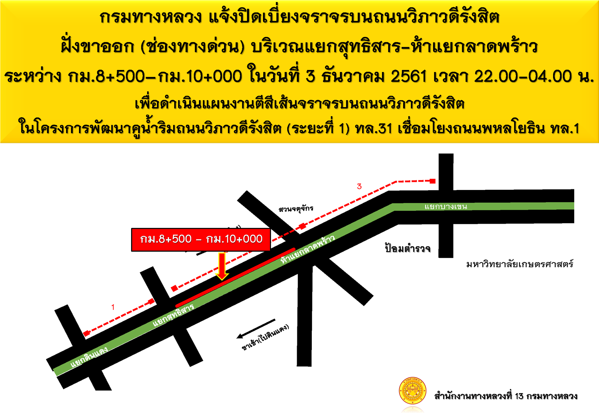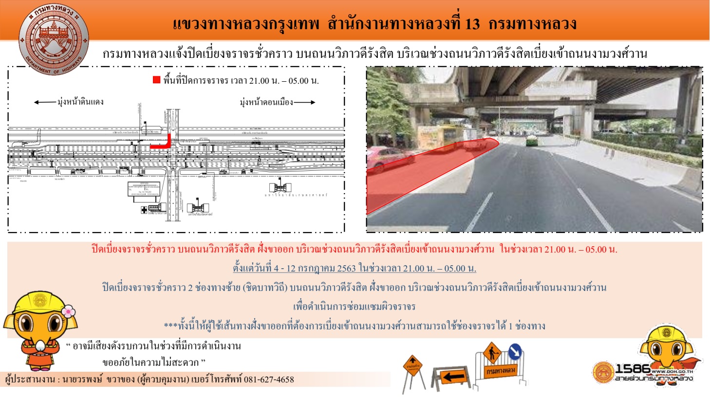 กรมทางหลวง โดย สำนักงานทางหลวงที่ 13 แจ้งปิดเบี่ยงจราจรบนถนนวิภาวดีรังสิต (ขาออก)