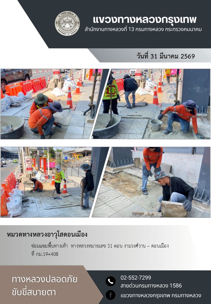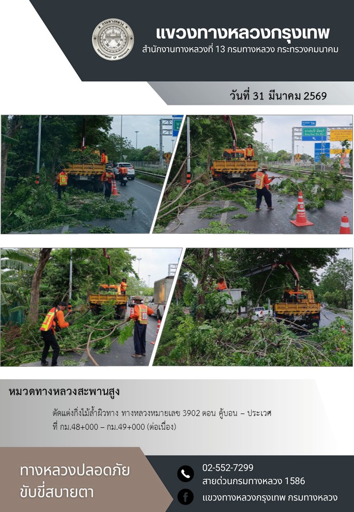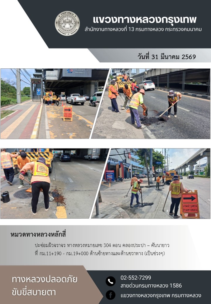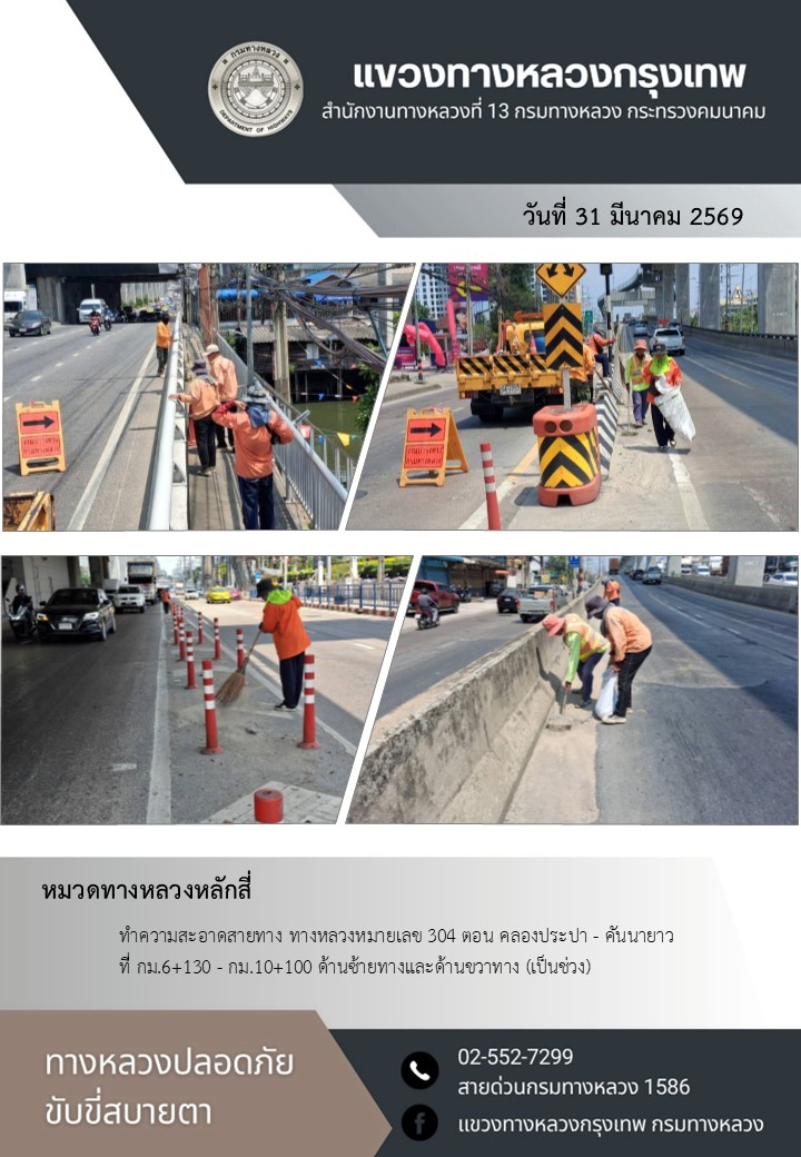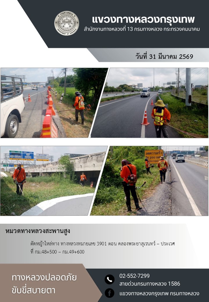"ทางหลวงปลอดภัย ขับขี่สบายตา แขวงทางหลวงกรุงเทพ" ประจำวันที่ 31 มีนาคม 2569
