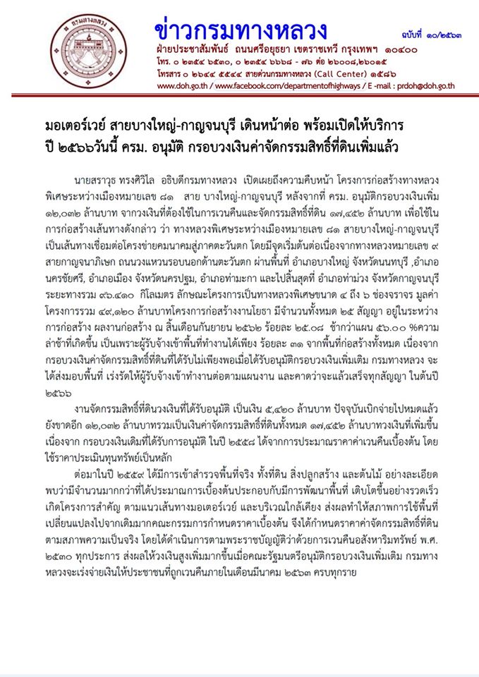 มอเตอร์เวย์ สายบางใหญ่-กาญจนบุรี เดินหน้าต่อ พร้อมเปิดให้บริการปี 2566 วันนี้ ครม. อนุมัติ กรอบวงเงินค่าจัดกรรมสิทธิ์ที่ดินเพิ่มแล้ว