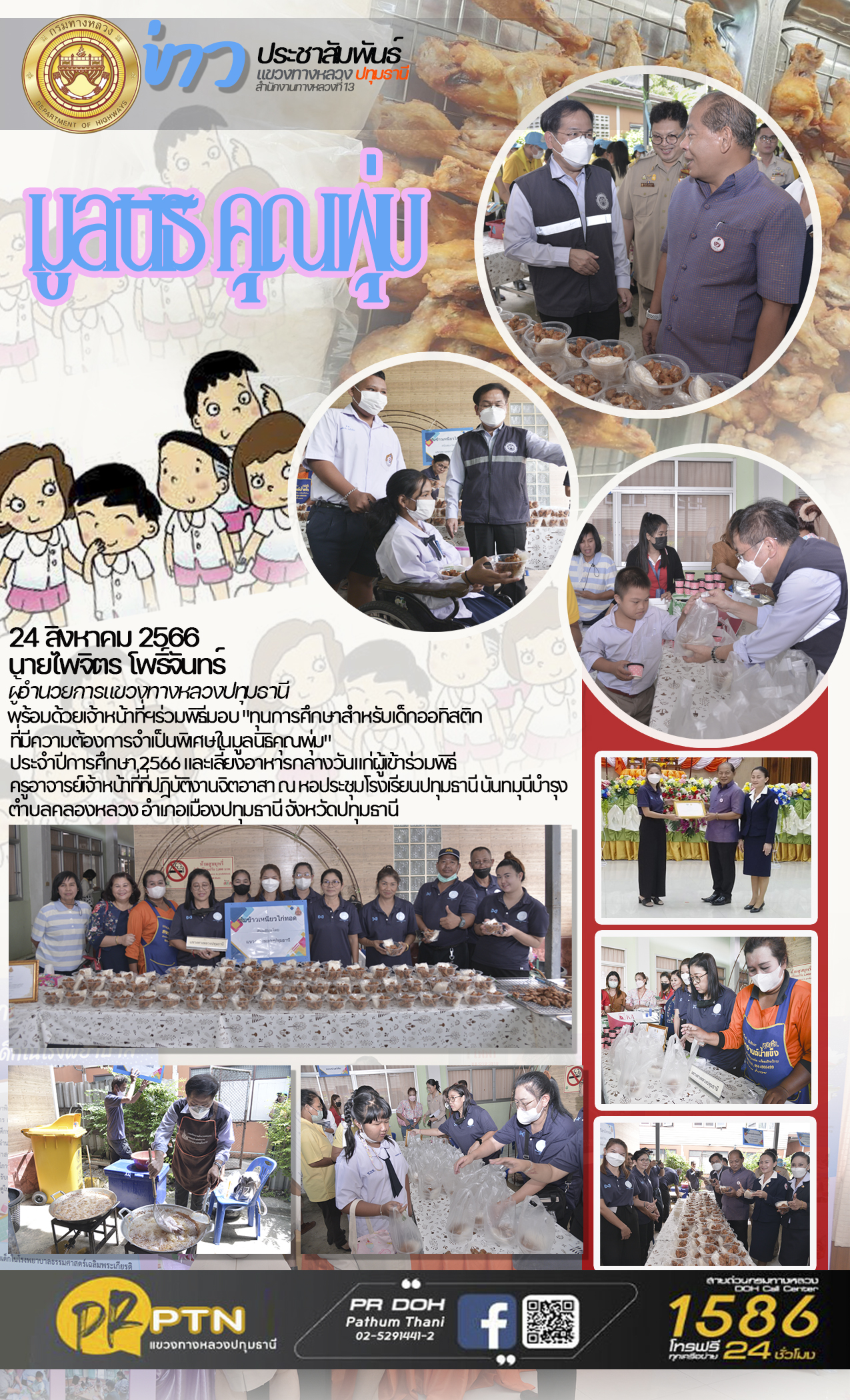 24 สิงหาคม 2566 นายไพจิตร โพธิ์จันทร์ ผู้อำนวยการแขวงทางหลวงปทุมธานี พร้อมด้วยเจ้าหน้าที่ฯ ร่วมพิธีมอบ "ทุนการศึกษาสำหรับเด็กออทิสติกที่มีความต้องการจำเป็นพิเศษในมูลนิธิคุณพุ่ม" ประจำปีการศึกษา 2566 และเลี้ยงอาหารกลางวันแก่ผู้เข้าร่วมพิธี ครู อาจารย์ และเจ้าหน้าที่ที่ปฎิบัติงานจิตอาสา ณ หอประชุมโรงเรียนปทุมธานี นันทมุนีบำรุง ตำบลคลองหลวง อำเภอเมืองปทุมธานี จังหวัดปทุมธานี
