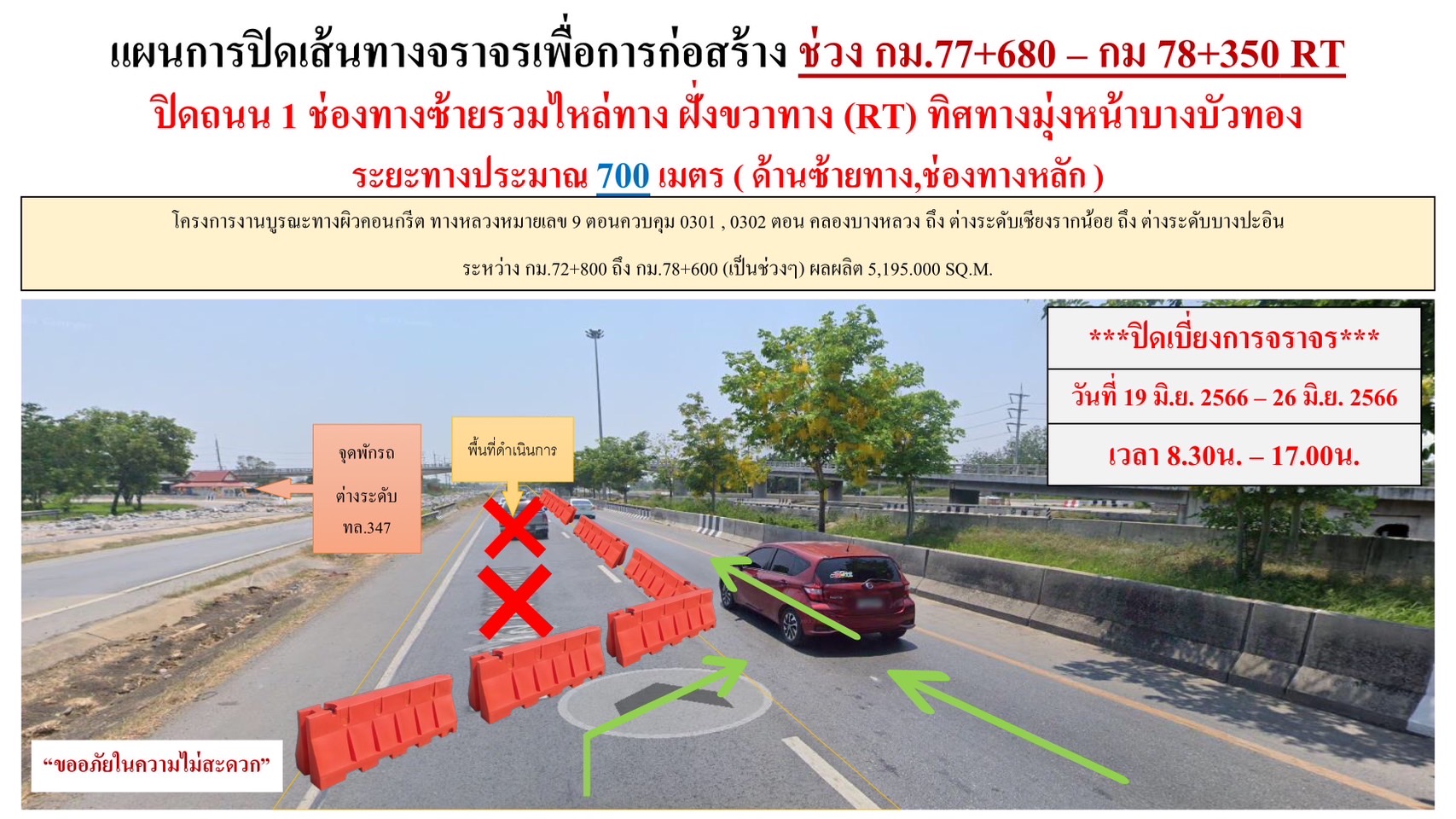 ประกาศแขวงทางหลวงปทุมธานี ดำเนินการปิดถนน 1 ช่องทางซ้ายรวมไหล่ทาง เพื่อบูรณะทางผิวคอนกรีตบนทางหลวงหมายเลข 9 กม.77+680 - กม.78+350 ฝั่งทางขวามุ่งหน้า (RT) มุ่งหน้าบางบัวทอง วันที่ 19 - 26 มิถุนายน 2566 เวลา 08.30 น. - 17.00 น.