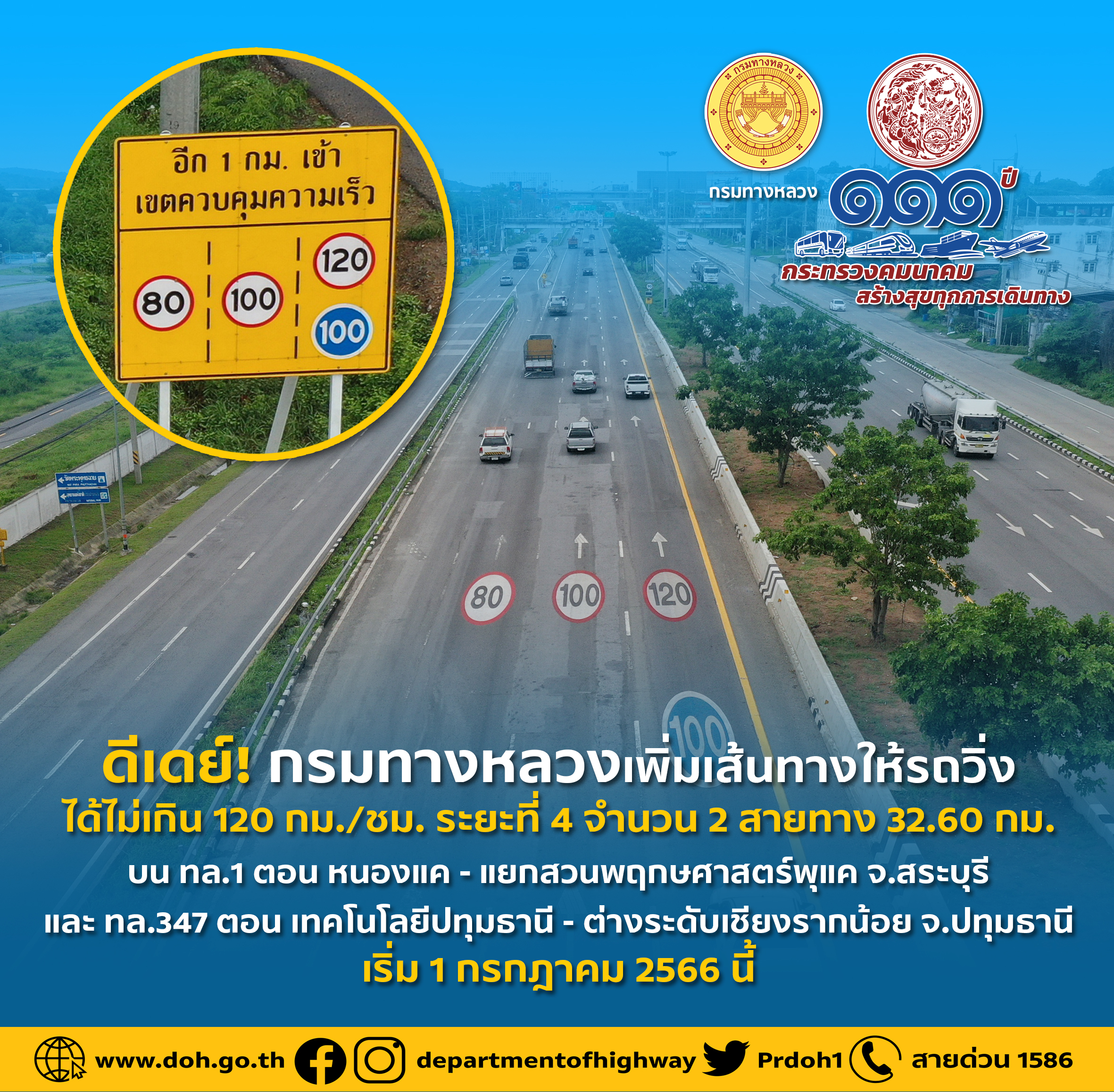 นายสราวุธ ทรงศิวิไล อธิบดีกรมทางหลวง เปิดเผยว่า กรมทางหลวงพร้อมอำนวยความสะดวก รวดเร็ว และปลอดภัย ให้กับประชาชนในการเดินทางตามนโยบายกระทรวงคมนาคม เรื่องการปฏิบัติตามกฎกระทรวงกำหนดอัตราความเร็วยานพาหนะบนทางหลวงแผ่นดินหรือทางหลวงชนบทที่กำหนด พ.ศ. 2564 โดยเพิ่มเส้นทางให้สามารถใช้ความเร็วจำกัดไม่เกิน 120 กม./ชม. และไม่ต่ำกว่า 100 กม./ชม. ในช่องขวาสุด จำนวน 2 เส้นทาง ทั้งขาเข้าและขาออก รวมระยะทาง 32.60 กิโลเมตร ซึ่งเป็นการดำเนินการตามนโยบายในระยะที่ 4 โดยจะมีผลบังคับใช้ตั้งแต่วันที่ 1 กรกฎาคม 2566 เป็นต้นไป ตามประกาศผู้อำนวยการทางหลวงแผ่นดิน โดยมีรายละเอียดดังนี้