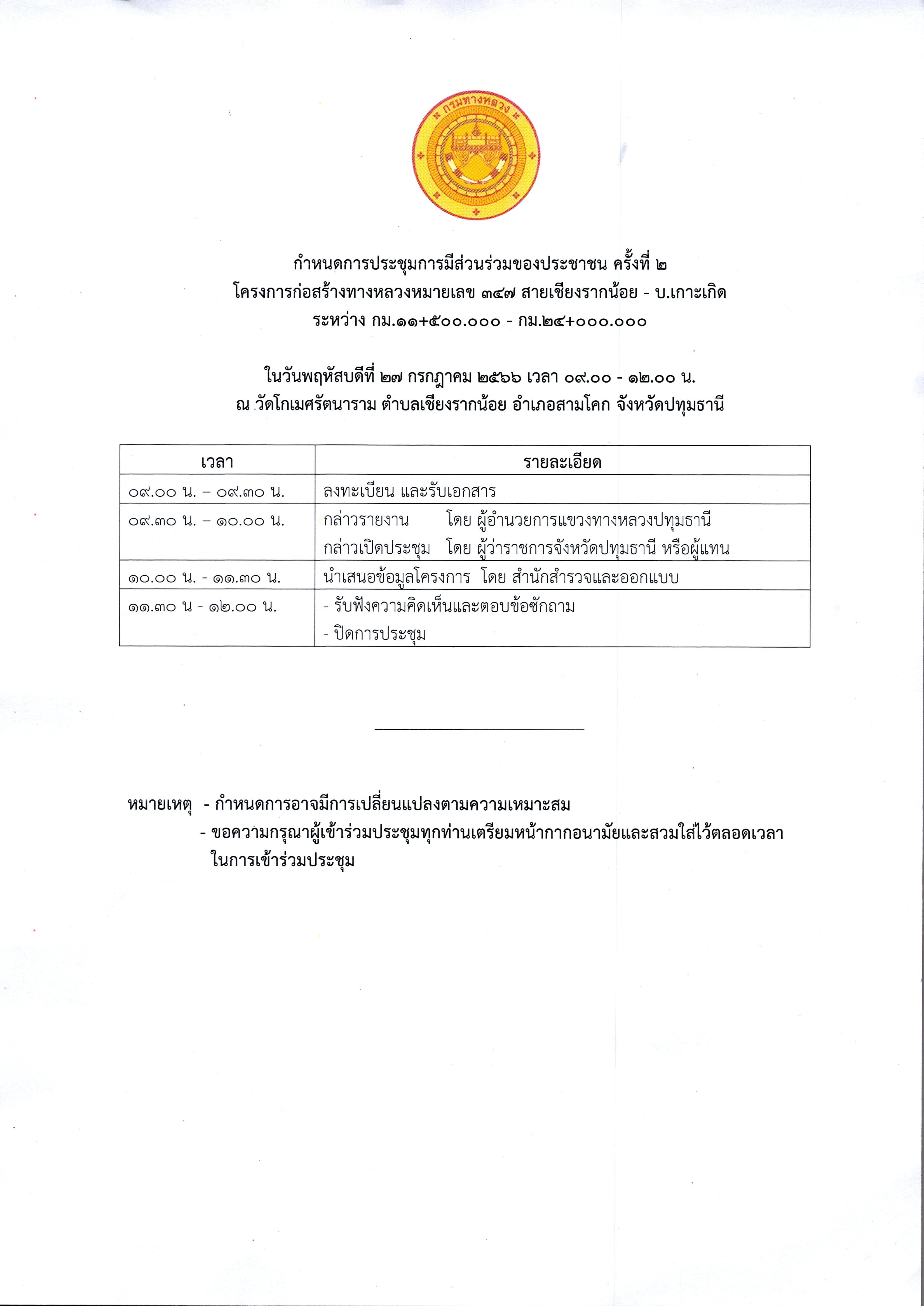 ประกาศแขวงทางหลวงปทุมธานี เรื่องการประชุมการมีส่วนร่วมของประชาชน ครั้งที่ 2 โครงการก่อสร้างทางหลวงหมายเลข 347 สายเชียงรากน้อย – บ.เกาะเกิด กม.11+500 - กม.24+000 ในวันที่ 27 กรกฎาคม 2566 เวลา 9.00 น. – 12.00 น. ณ วัดโกเมศรัตนาราม