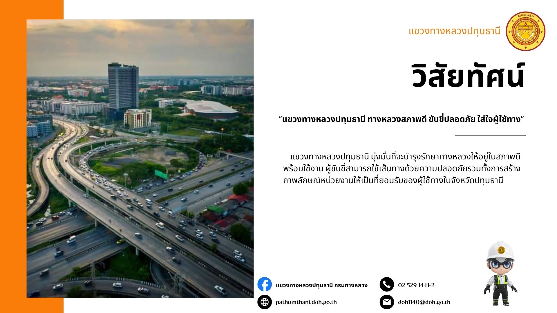 วิสัยทัศน์ : “แขวงทางหลวงปทุมธานี ทางหลวงสภาพดี ขับขี่ปลอดภัย ใส่ใจผู้ใช้ทาง”