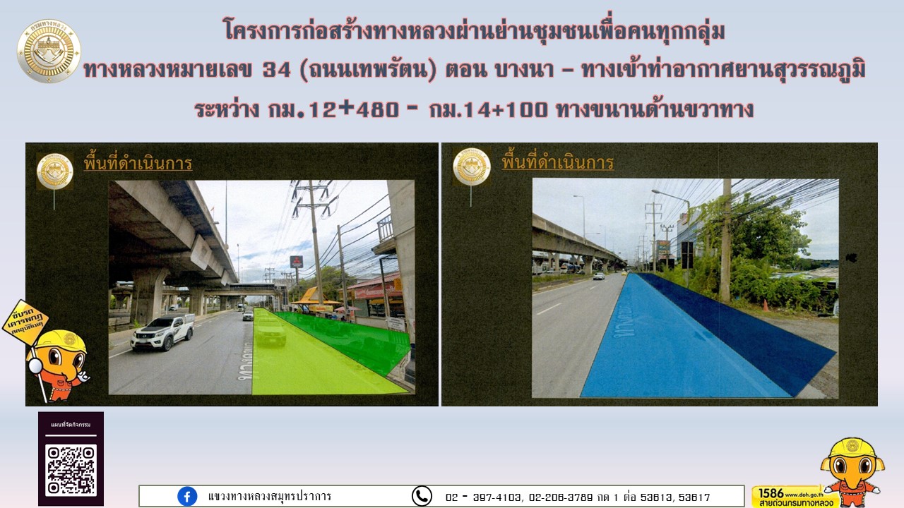 ด้วยแขวงทางหลวงสมุทรปราการ (กรมทางหลวง) ได้รับการจัดสรรงบประมาณดำเนินการก่อสร้างโครงการก่อสร้างทางหลวงผ่านย่านชุมชนเพื่อคนทุกกลุ่ม ทางหลวงหมายเลข 34 (ถนนเทพรัตน) ตอน บางนา - ทางเข้าท่าอากาศยานสุวรรณภูมิ ระหว่าง กม.12+480 - กม.14+100