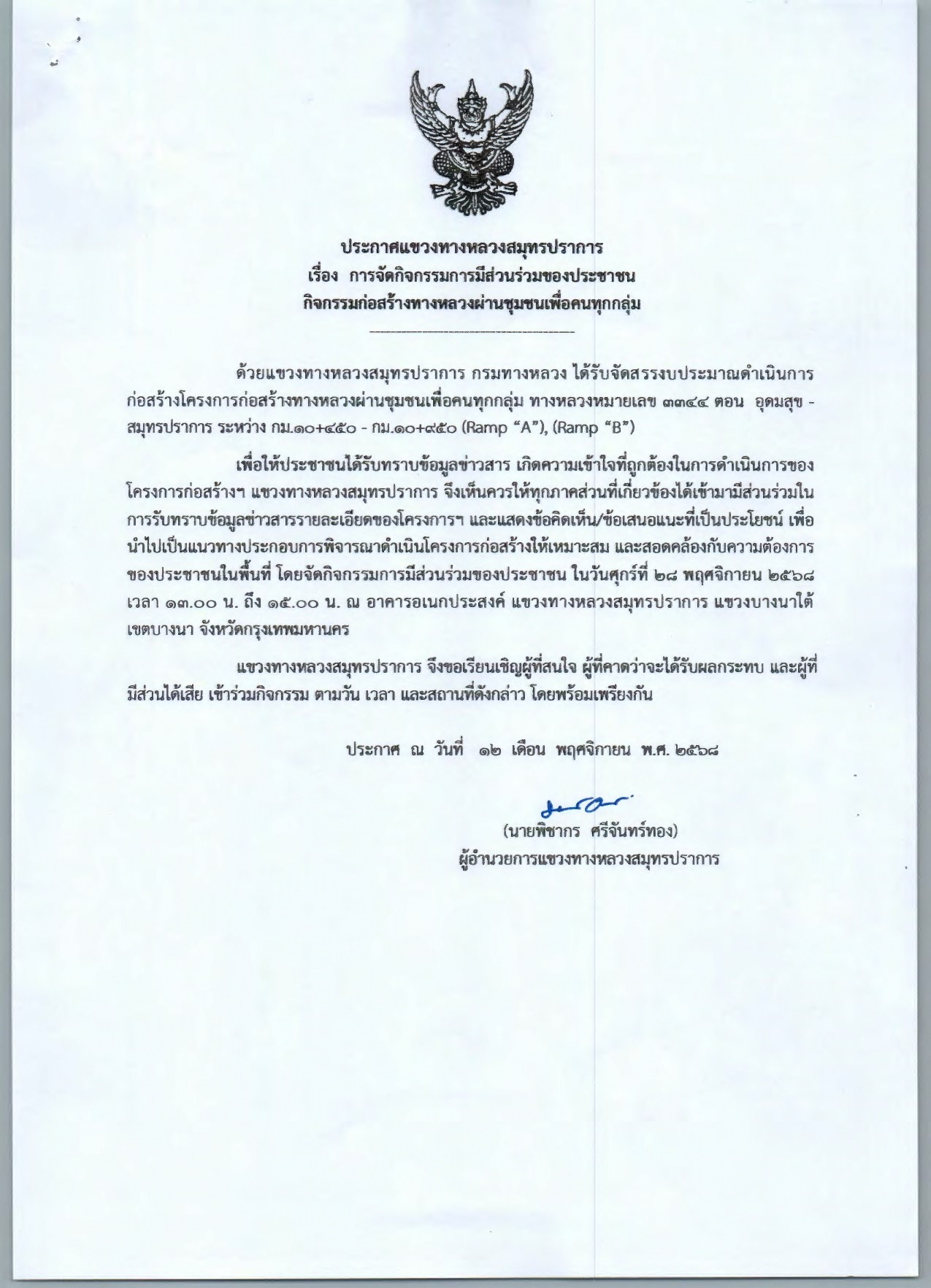 ขอเชิญประชาชนเข้าร่วม กิจกรรมการมีส่วนร่วมของประชาชนด้วยแขวงทางหลวงสมุทรปราการ (กรมทางหลวง) ได้รับการจัดสรรงบประมาณดำเนินการก่อสร้างโครงการก่อสร้างทางหลวงผ่านย่านชุมชนเพื่อคนทุกกลุ่ม